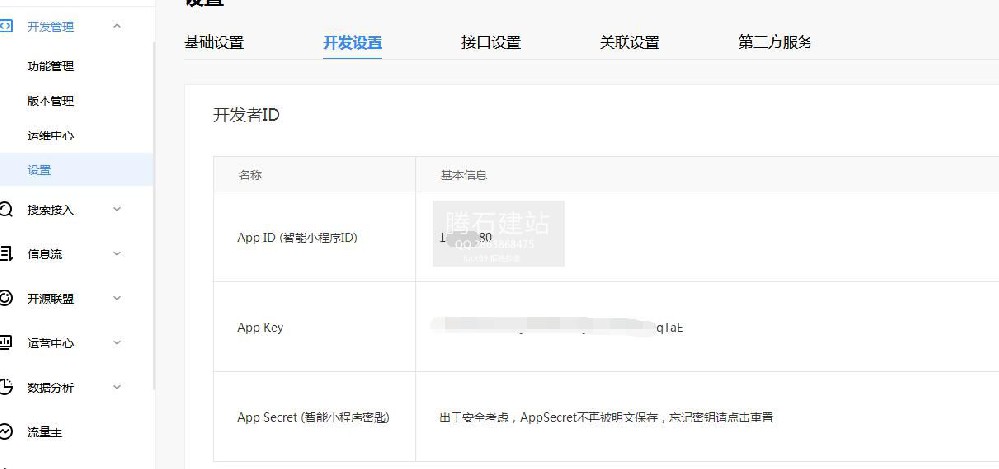 (2)申请过后登陆你的小程序账号,进入“开发管理”----“设置”----切换到“开发设置”如图,保存自己的appid、appkey以及appsecret,特别是appsecret只出现一次,一定要保存好