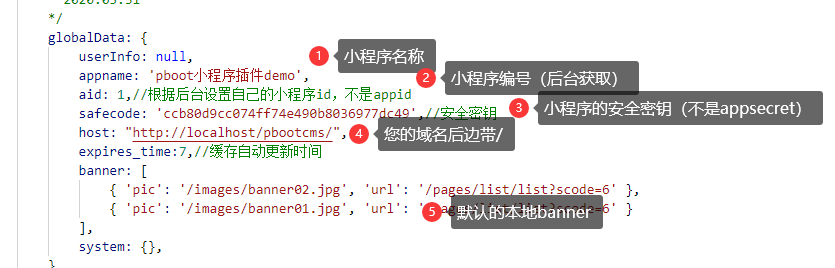 (2)打开app.json、app.js把我的信息都改成你们的,特别是app.js中的safecode(暂时填写appsecret),aid暂时默认,为后期准备