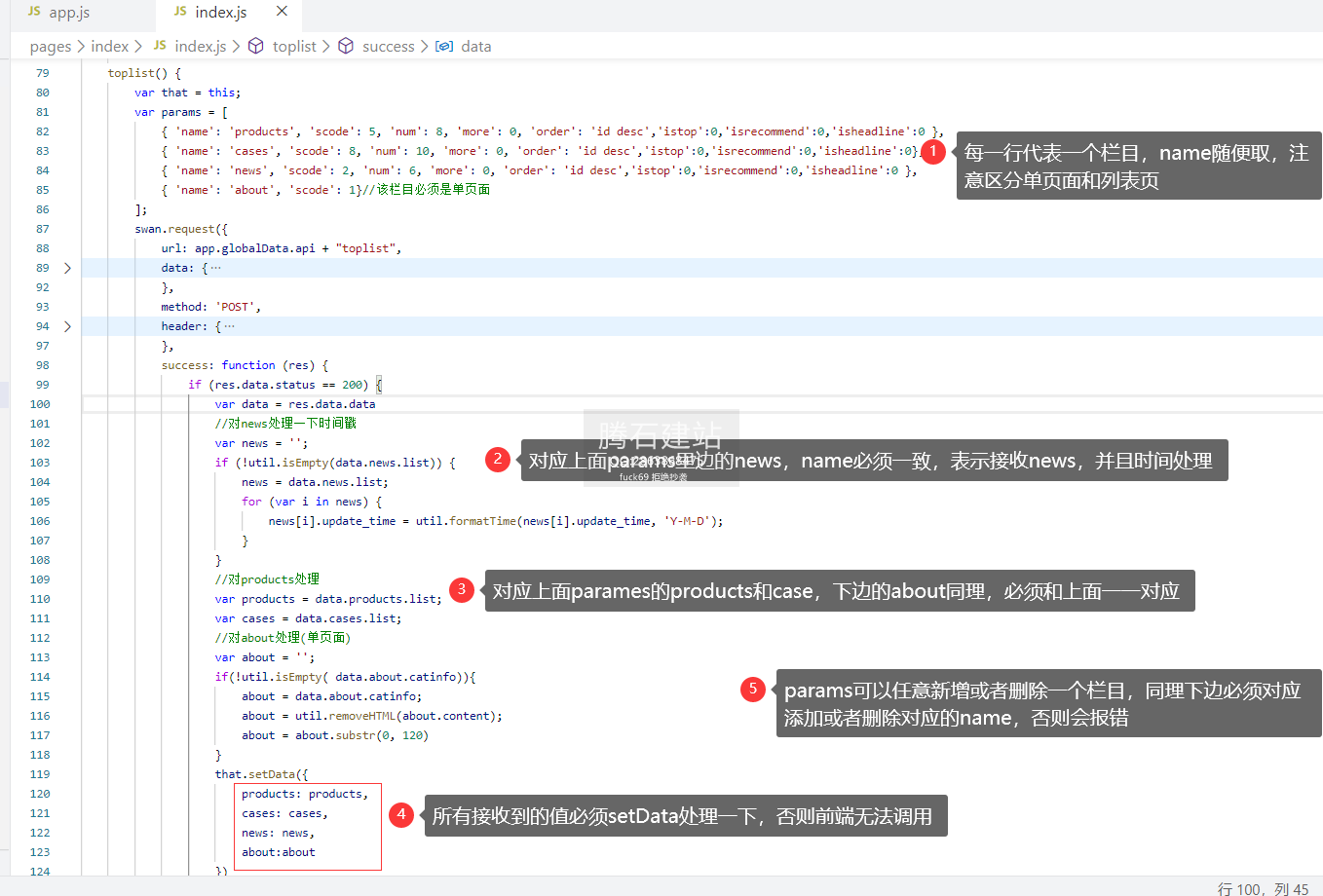/pages/下的每个文件夹代表一个独立的页面,其中swan是写div的,css是写css的,js是读取接口的,js中读取的接口必须用setData赋值一下,前端才可以调用,以上面的toplist获取的news为例: