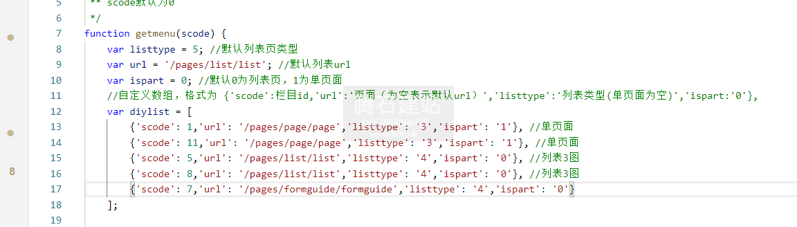 小程序对接好之后,所有的栏目都是默认文章列表页的,但是我们实际可能会出现频道页或者图片列表页,产品列表页的。打开utils/common.js找到最上面的getmenu方法。顾名思义,getmenu表示获取一级栏目菜单